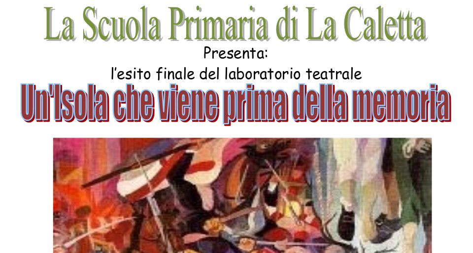 È in programma per questa sera alle 21:30 - presso la pineta di San Giovanni (ex colonia P.S.) - “Un'Isola che viene prima della memoria”, spettacolo realizzato da un gruppo di alunni provenienti da tutte le classi della Scuola Primaria di La Caletta. La rappresentazione, esito finale del laboratorio teatrale, è condotta dal regista Oreste Braghieri in collaborazione con le maestre Marilena Mula, Silva Jaloux e Lucia Saggia. Questi i nomi dei ragazzi in scena: Federica Cherchi, Elena Loddo, Rebecca Lucchese, Francesca Salis, Maria Loriga, Davide Marras, Francesco Mura, Roberto Farris, Elias Salis, Martina Sanna, Matteo Secchi, Sara Turnu, Giovanni Carrozzo, Beatrice Conteddu, Gaia Farris, Anna Calzedda, Francesco Lambroni, Maria Lovicu, Elene Piras, Riccardo Sanna, Federico Usai, Manuel Farris, Riccardo Gusai.