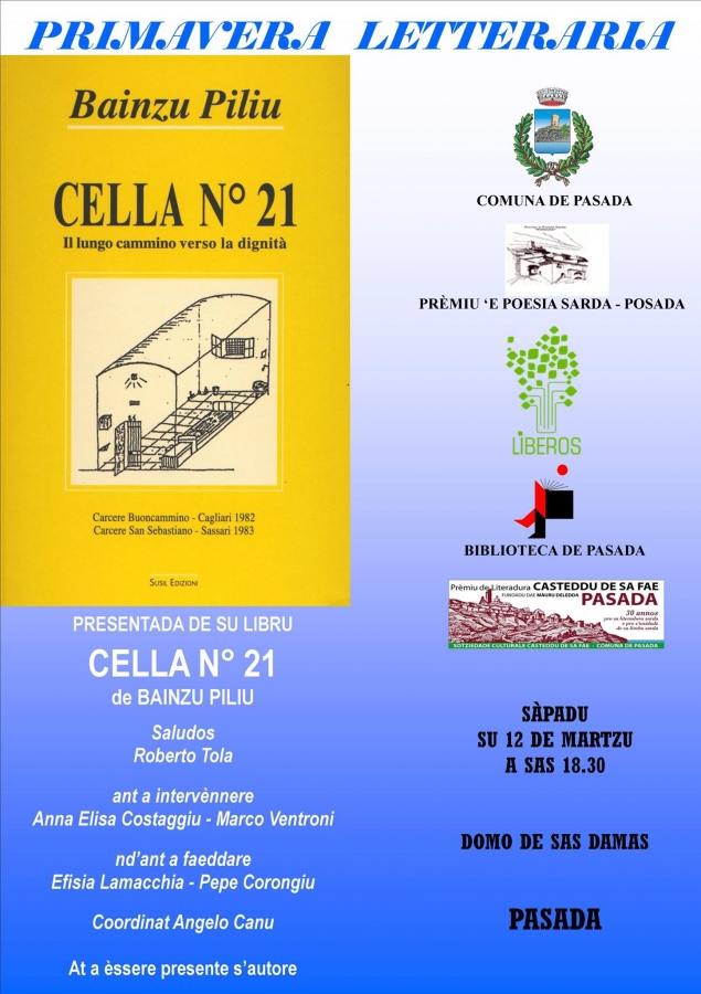Questo pomeriggio sarà presentato il libro “Cella n° 21”, autobiografia di Bainzu Piliu. Accusato di essere a capo di un complotto separatista nei primi anni ottanta, Piliu venne condannato e recluso per quattro anni, sia nel carcere sassarese di San Sebastiano che in quello cagliaritano di Buoncammino (in entrambe i casi nella cella numero 21).