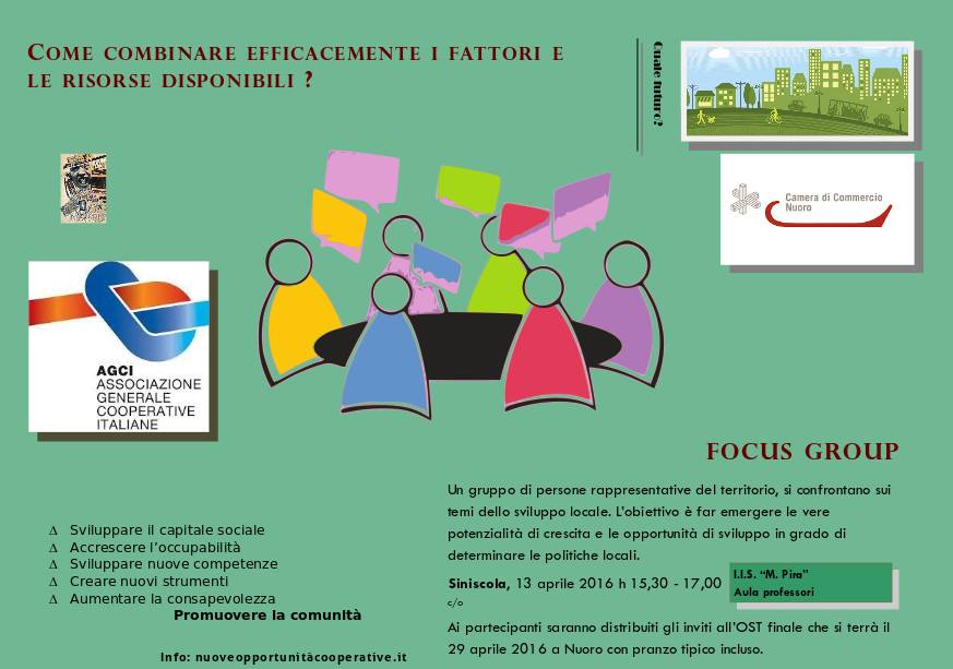 L'AGIC (Associazione Generale Cooperative Italiane) Sardegna, con il patrocinio della Camera di Commercio di Nuoro, intende realizzare - nell'ambito del progetto "Nuove opportunità cooperative” - una serie di focus group nei territori della provincia Nuoro e Ogliastra sul tema "Sviluppo locale, la domanda dal basso".