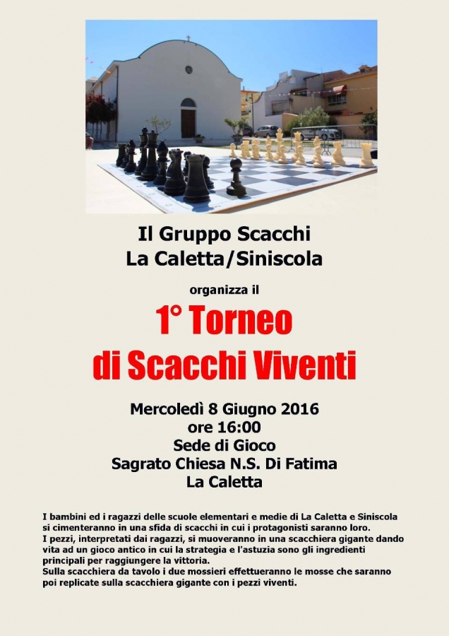 La Caletta – Il Gruppo Scacchi La Caletta/Siniscola organizza il 1° torneo di Scacchi viventi. L'appuntamento è per domani alle 16.00 presso il sagrato della chiesa Nostra Signora di Fatima.