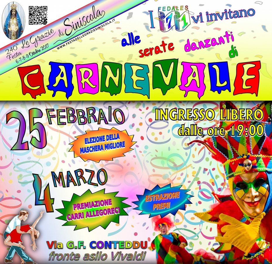 Fervono i preparativi per le manifestazioni dell'imminente Carnevale. Tra gli appuntamenti siniscolesi vi sono anche due serate messe a punto dai “Fedales 1971”, la leva che sta organizzando la 240ma festa delle Grazie. Appuntamenti previsti il 25 febbraio e il 4 marzo (dalle 19:00) nella struttura di via Conteddu situata di fronte all'asilo Vivaldi. Con un proprio punto ristoro, la Leva '71 sarà inoltre presente il 26 febbraio in piazza Don Migliorisi al termine della sfilata dei carri allegorici e dei gruppi in maschera.
