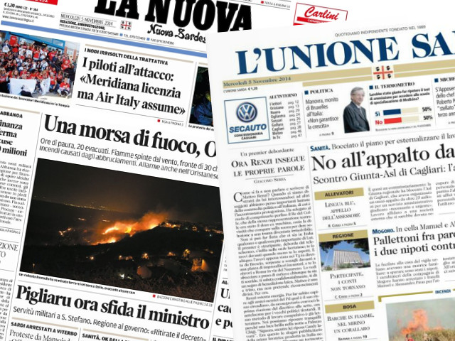 Mancari chi sas novas in pitzu de sos fogos siant tìpicas de sas editziones istadiales de sos giornales sardos, acò chi La Nuova Sardegna aberit contende·nos sa timòria de sas populatziones de Òsile: «framas ispintas dae su bentu, fronte de 30 chilòmetros dae Bonorva conca a Tàtari. Fogos cajonados dae sos abbrusiamentos. Allarme finas in s'oristanesu. In Tèmpiu su fogu minetzat da presone». L'Unione ponet in evidèntzia sa serrada de sa 131: «fogu finas in Àrthana, firmos sos trenos in Òschiri». Pro su restu àteras duas novas regionales dòminant sas primas pàginas de oe. In contu de tzerachias militare «Pigliaru como disafiat su ministru». La Nuova nos contat chi su Presidente de sa Regione at presentadu unu recursu «contra a s'impositzione pro àteros chime annos de sa tzerachia in sa “Guardia del moro” in sa Madalena». «Nono a s'apaltu de 25 milliones» est imbetzes su tìtulu de L'Unione: «Est belle unu commissariamentu: sa Giunta regionale at arreadu s'Asl de Casteddu chi aiat ammaniadu un'apaltu chi colaiat sos 25 milliones pro unu servìtziu amministrativu giuigadu “netzessàriu e urgente”. Traballu afidadu a una sotziedade esterna chi si fiat dèvida ocupare de assùmere e gestire su personale»