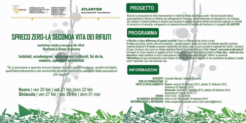 Si svolgerà il 27-28 febbraio e 1 marzo 2015 presso l'Aula consiliare del Municipio (9.00-13.00; 14.00-18.00) il workshop gratuito sul riciclo e recupero dei rifiuti organizzato dalla Cooperativa sociale Lariso all'interno del progetto Atlantide.
