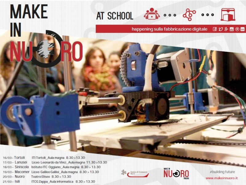 «Introdurre gli studenti alle nuove tecnologie di fabbricazione digitale e alla nuova imprenditorialità, per orientarli al meglio verso le loro scelte future». È questo l’obiettivo di “Make in Nuoro at School”, seminario itinerante - promosso dalla Camera di commercio nuorese - che mercoledì 18 marzo farà tappa all'Istituto Tecnico Luigi Oggiano (dalle 8.30 alle 13.30).