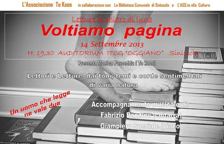 Il 14 settembre alle 19.30, presso l'auditorium ITCG “Luigi Oggiano”, si svolgerà il reading letterario  “Voltiamo pagina – Libere letture al chiaro di Luna”, organizzato dalla compagnia teatrale To Kaos in collaborazione con la biblioteca comunale e l'Assessorato alla cultura. I lettori saranno accompagnati dalla chitarra di Fabrizio Bandinu e dal piano di Giampiero Speziale.