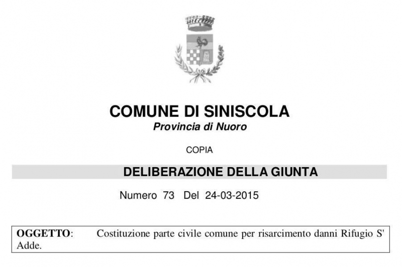 In merito all'incendio che ha recentemente danneggiato due pinnatos del “Rifugio S'Adde” (adiacente al Km 33 della provinciale Siniscola – Lula), la Giunta comunale ha deciso, tramite delibera, di «avvalersi del diritto per far valere la responsabilità civile ai fini del risarcimento del danno patrimoniale e ambientale». La stima dei danni arrecati «ammonta a più di 30mila euro, vista la relazione tecnica».