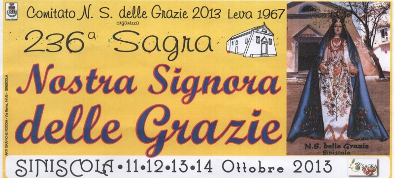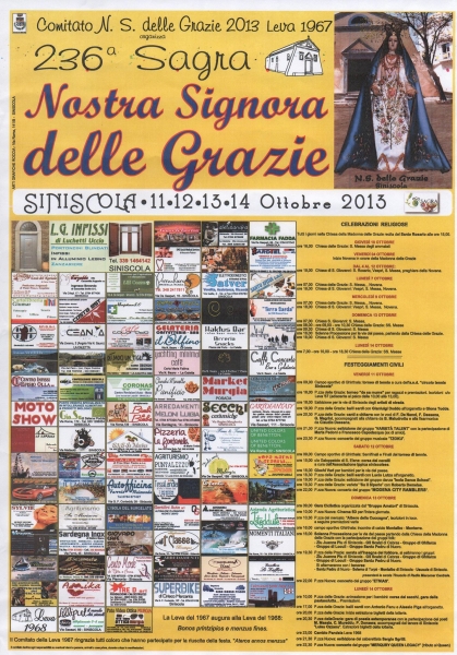 Anche quest'anno, la sagra di Nostra Signora delle Grazie (organizzata dalla Leva '67) prevede un ricco programma (11, 12, 13 e 14 ottobre) con numerose iniziative.  Oltre le celebrazioni relegiose, i festeggiamenti civili animeranno quattro giorni con un'offerta per tutti i gusti.
