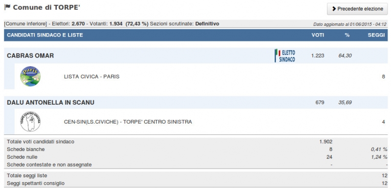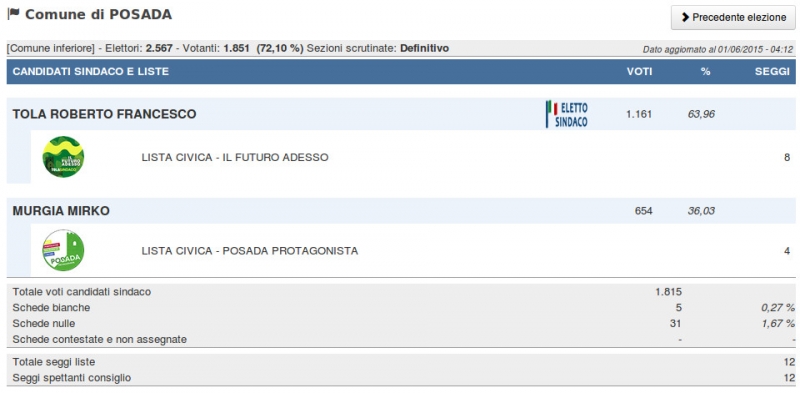 Arrivati nel cuore della notte i risultati della tornata elettorale che ha coinvolto i vicini centri di Posada e Torpè. In entrambe le località l'affluenza al voto ha superato il 72%. Dallo spoglio delle schede si è registrata la riconferma di Roberto Tola a Posada e la vittoria di Omar Cabras a Torpè.