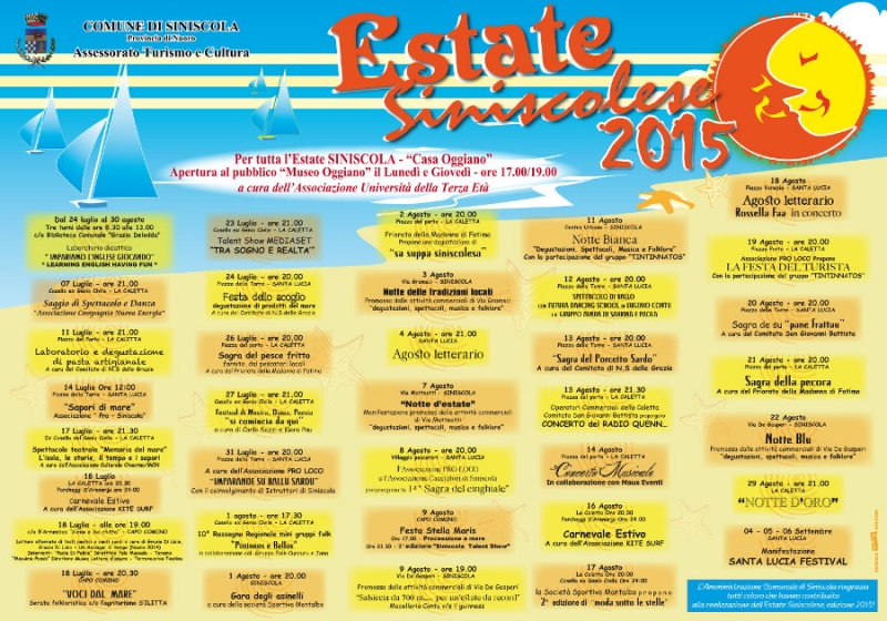 Condividi su: È stato pubblicato oggi, nel sito istituzionale del Comune, il programma dell'Estate siniscolese 2015. Cliccando sulla miniatura si verrà reindirizzati al file scaricabile. Condividi su: