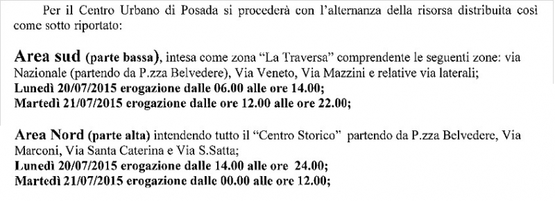 Le zone relative al serbatorio di Monte Longu (La Caletta per quanto riguarda Siniscola; San Giovanni, Paule e Mare, via Gramsci, via Nenni e traverse per quanto riguarda Posada) subiranno interruzioni già dalla giornata di domenica 19 luglio: dalle 14.00 (La Caletta) e dalle 20.00 (zone Posada)