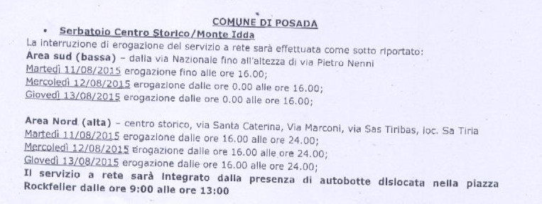 Aggiornamento del 12 agosto: Abbanoa ha comunicato la fine dell'emergenza a Siniscola e il suo perdurare a Posada. Il servizio autobotte sarà trasferito presso la piazza Sardegna della borgata di San Giovanni di Posada.
