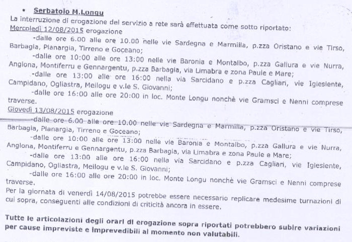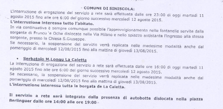 «A seguito della ulteriore riduzione della portata dalla sorgente di Fruncu 'e Oche, che apporta volumi di gran lunga inferiori rispetto allo stesso periodo dello scorso anno in concomitanza con notevole incremento delle presenze, si è reso necessario adottare un piano di azione che prevede la chiusura alternata della fornitura, almeno fino al ripristino delle condizioni che permettano l'erogazione continuativa del servizio».