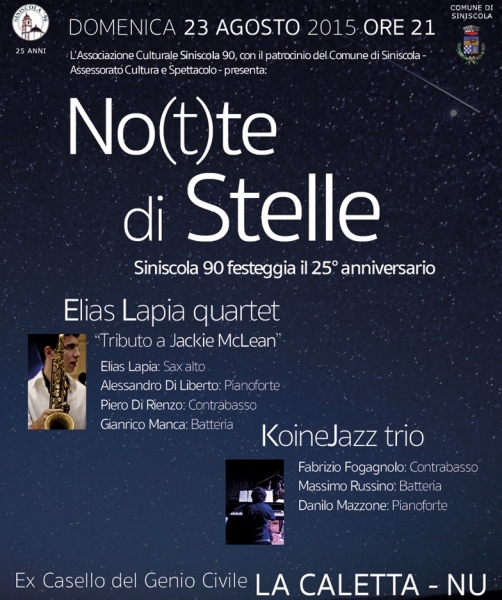 Si svolgerà domenica 23 agosto a La Caletta “No(t)te di Stelle”, serata jazz organizzata dall'Associazione culturale Siniscola 90 - in occasione dei suoi 25 anni di attività - con il patrocinio del Comune di Siniscola (Assessorato Cultura e Spettacolo).