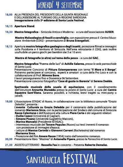 SANTA LUCIA - Tutto pronto per la terza edizione del “Santa Lucia Festival”, la «kermesse di tre giorni – come si legge sul sito istituzionale del Comune siniscolese – dedicata all'ambiente, alla cultura, alle tradizioni, alla musica, all'arte e agli spettacoli, realizzata con la collaborazione della Pro Loco». L'evento avrà inizio venerdì 4 settembre alle 18.00 e si concluderà domenica 6.