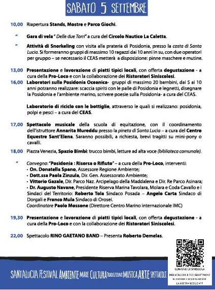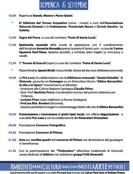 «Abbiamo riproposto – così il Sindaco Celentano – il consolidato format che comprende incontri culturali, workshop, concerti e spettacoli, installazioni artistiche, mostre mercato, iniziative dedicate ai più piccoli, presentazione di libri e progetti ecostenibili. Nonostante la crisi e i tagli ai finanziamenti, si vuole mandare un messaggio di speranza con questa importante manifestazione che, ogni anno, fa accorrere nello splendido borgo marino di Santa Lucia migliaia di visitatori. I numeri delle edizioni passate hanno reso realtà quella che sembrava solo una straordinaria potenzialità raggiungendo rilevanti presenze ed entrando a pieno titolo tra le manifestazioni culturali e turistiche più importanti in Sardegna. Le energie saranno concentrate sulle tematiche legate alla sensibilizzazione ambientale (mare, spiagge, posidonia, rifiuti, turismo ambientale e acqua) facendo diventare la manifestazione una vetrina nazionale di tutte la campagne e attività del Comune».