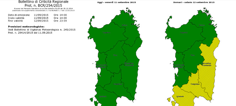 Il Centro Funzionale Decentrato, visto il BOLLETTINO DI CRITICITÀ n. BCR/254/2015 del 11/09/2015, comunica che: