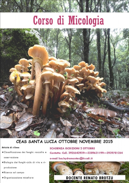 Il Centro di educazione ambientale di Santa Lucia organizza per i mesi di ottobre e novembre un corso di micologia articolato in sette lezioni. Tra le attività guidate dal docente Renato Brotzu vi saranno: classificazione, raccolta e osservazione; biologia, ciclo di vita e riproduzione; ricerca sul campo; organizzazione miceliare. Gli incontri si terranno nella sede del Ceas in via Giovanni da Verrazzano. La scadenza dei termini per le iscrizioni è prevista per il 2 ottobre «ma essendoci il numero chiuso – sottolineano gli organizzatori – consigliamo agli interessati di confermare prima l'iscrizione in modo da trovare posto». Il costo del corso è di 60 euro a persona. Maggiori info sul sito del Ceas Santa Lucia.