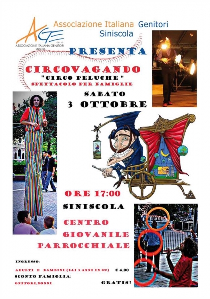 Si svolgerà sabato 3 ottobre, presso il Centro giovanile parrocchiale, “Circovagando–Spettacolo per famiglie” organizzato dall'Associazione A.Ge Onlus. L'appuntamento è previsto per le 17.00.