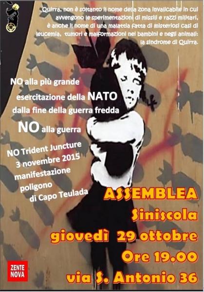 Gli attori della Trident Juncture 2015 «testeranno - si legge nella nota stampa - le armi e le migliori strategie per sopraffare e annientare altri popoli nelle nuove guerre. Infatti, con la scusa del terrorismo dell’ISIS e della lotta ai trafficanti di esseri umani per fermare l’ondata di profughi, si stanno preparando a nuovi interventi militari ad Est e nel Sud del mondo. In questa esercitazione, come nelle operazioni di guerra, la Sardegna avrà un ruolo chiave. La nostra terra, da anni, paga un prezzo altissimo sull'altare della sperimentazione militare: ieri Quirra, oggi Capo Teulada. Non rendiamoci complici! Opponiamoci alle esercitazioni per dire no alla politica di aggressione della Nato che rischia di portarci ad un nuovo conflitto mondiale. Opponiamoci al Governo che, mentre chiede continui sacrifici per “uscire dalla crisi economica”, spende circa 30 miliardi di dollari l’anno per attaccare altri paesi e acquistare nuove armi. Per capirsi, Quirra è la metafora di ciò che sarà Capo Teulada: un esperimento militare. Quirra è la coscienza sporca di eserciti di tumori, leucemie e malformazioni che hanno colpito uomini, bambini, animali. Capo Teulada è il nuovo agnello sacrificale sull'altare della guerra da esportare negli angoli bui del mondo, quelli degli interessi economici e imperialisti di un Occidente che dove fa il deserto lo chiama pace. In vista della manifestazione di martedì 3 novembre a Capo Teulada, in molti territori della Sardegna, i sardi rispondono organizzando l'informazione e la protesta. A Siniscola sarà il 29 ottobre». L'appuntamento è per le 19.00 presso la sede di Via S. Antonio 36.