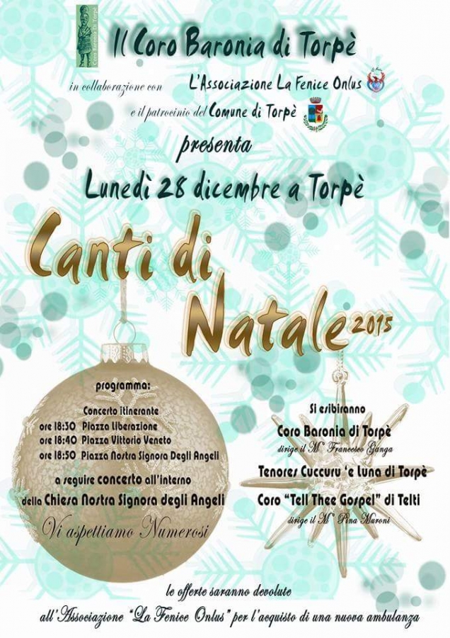 Torpè – Il Coro Baronia di Torpè, in collaborazione con l'Associazione "La Fenice Onlus" e il patrocinio del Comune, organizza il concerto itinerante “Canti di Natale 2015”. Ad esibirsi saranno il Coro Baronia, il Tenore Cuccuru 'e luna di Torpè e il Coro “Tell Three Gospel” di Telti.