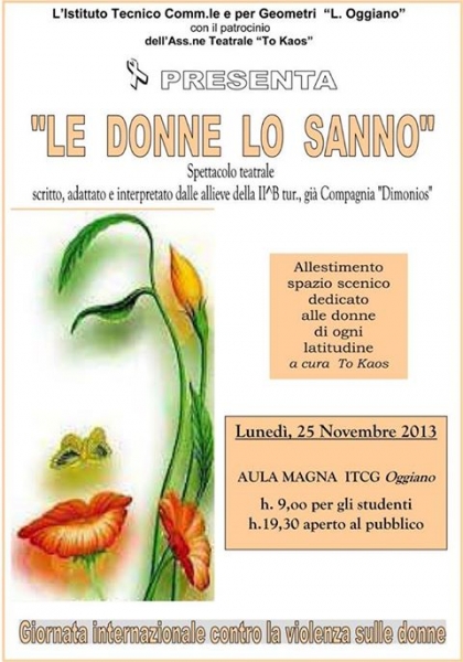 Domani 25 novembre, giornata internazionale contro la violenza sulle donne, nell'Aula Magna dell'ITCG Luigi Oggiano il sipario si alzerà su “Le donne lo sanno”, spettacolo scritto, adattato e interpretato dalle allieve della IIB Turistico (già note come compagnia Dimonios). L'evento, che prevede due appuntamenti, alle 9,00 (per gli studenti) e alle 19,30, è patrocinato dalla compagnia teatrale To Kaos che per l'occasione allestirà uno spazio scenico “dedicato alle donne di ogni latitudine”.
