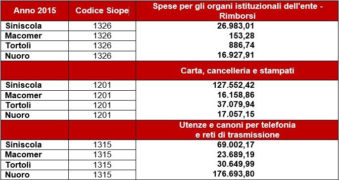 «A differenza di altre soluzioni sperimentate in passato - spiega Zente Nova - soldipubblici.gov.it non mostra le cifre dei dati di bilancio, quindi delle spese che ogni amministrazione prevede di fare, ma gli effettivi pagamenti riferiti alla data nella quale sono stati effettuati realmente. Le cifre indicate sul sito sono quindi le spese effettive indicate dal tesoriere dell’ente che si sta consultando. Ebbene le voci di spesa che più ci hanno colpito sono quelle relative alle utenze telefoniche, alla cancelleria, nonché la spesa affrontata per rimborsi degli organi istituzionali dell’Ente (scriviamo di rimborsi quali spese di viaggio e rappresentanza, non delle indennità , che sono un’altra cosa). La tabella allegata è eloquente, parla da sola e analizza la spesa sostenuta nel 2015».