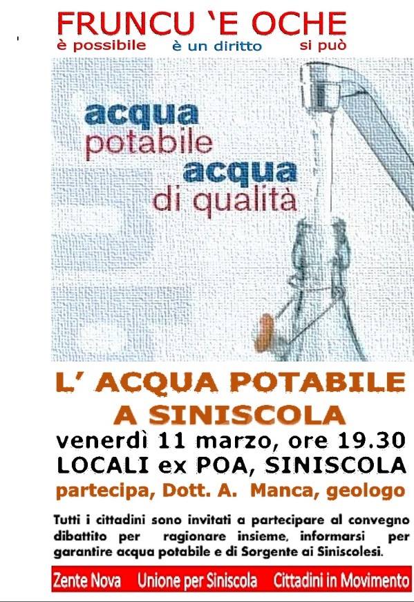 È in programma per venerdì 11 marzo alle 19.30, presso i locali ex Poa, l'incontro-dibattito dal titolo “L'acqua potabile a Siniscola”.