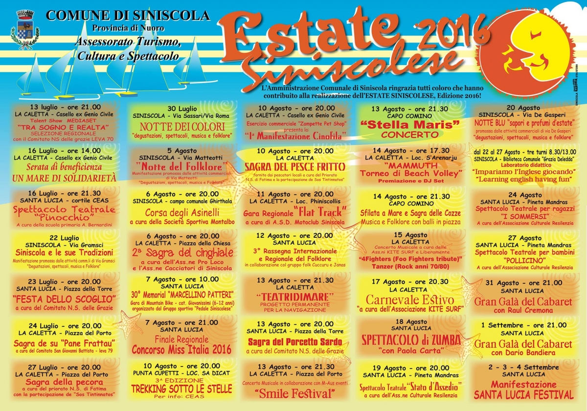 Condividi su: Il Comune di Siniscola (Assessorato al Turismo, Cultura e Spettacolo) ha pubblicato il calendario dell'Estate siniscolese 2016. Di seguito tutti gli appuntamenti in programma: (cliccare sull'immagine per ingrandirla) Condividi su:
