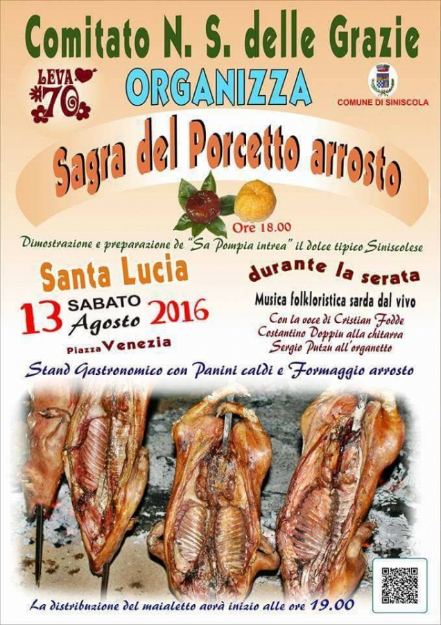 Santa Lucia – È in programma per questa sera in piazza Venezia, nell'ambito dell'Estate siniscolese 2016, la “Sagra del porcetto arrosto” organizzata dal Comitato Nostra Signora delle Grazie (Leva '70) con il patrocinio del Comune.