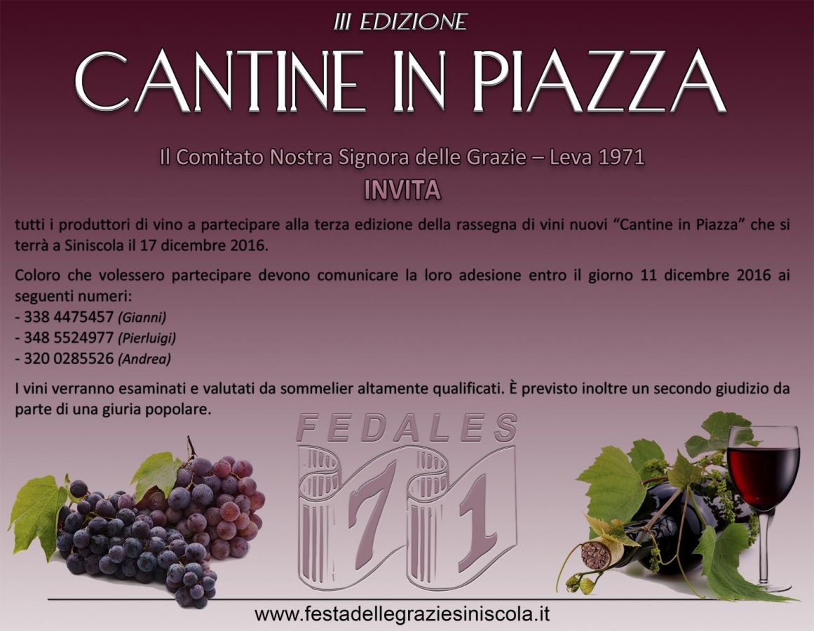 Fervono i preparativi per la terza edizione della rassegna di vini nuovi “Cantine in Piazza” prevista per il 17 dicembre 2016. Il Comitato Nostra Signora delle Grazie – Leva 1971 invita chi volesse partecipare a comunicare la propria adesione entro domenica 11 dicembre. Questi i contatti: