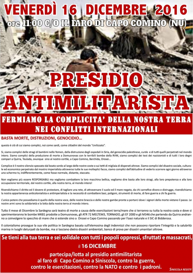 il 16 DICEMBRE partecipa/lotta al presidio antimilitarista davanti al faro di Capo Comino a Siniscola, contro la guerra, contro le esercitazioni, contro la NATO e contro i padroni.