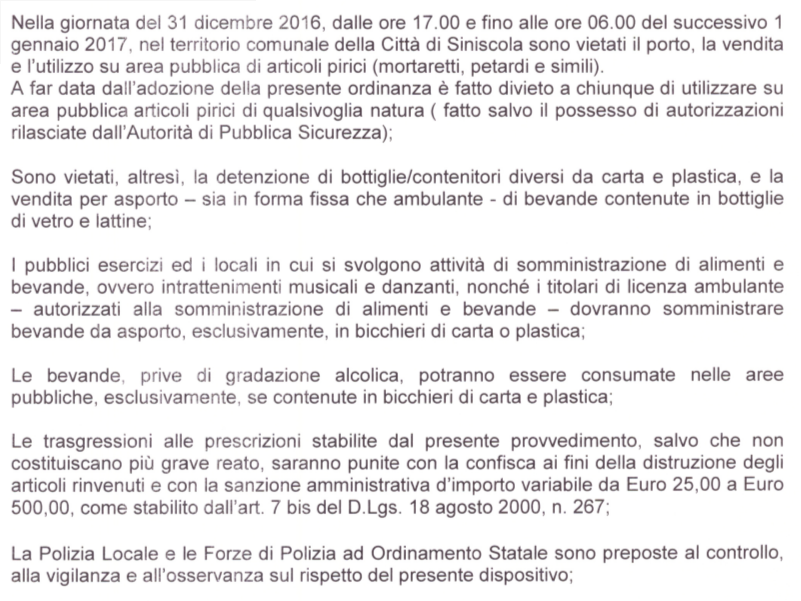«Nella giornata del 31 dicembre 2016, dalle ore 17.00 e fino alle ore 6.00 del successivo 1 gennaio 2017 – si legge nel documento –, nel territorio comunale della Città di Siniscola sono vietati il porto, la vendita e l’utilizzo su area pubblica di articoli pirici (mortaretti, petardi e simili), fatto salvo il possesso di autorizzazioni rilasciate dall’Autorità di Pubblica sicurezza».