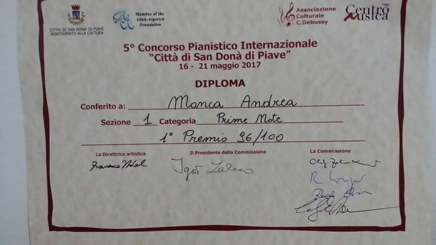 Nuovo successo per il pianista siniscolese Andrea Manca. Il giovanissimo mago dei tasti d'avorio ha vinto il primo premio categoria “Prime note” nella quinta edizione del concorso internazionale “Città di San Donà” in Veneto. Attribuendogli 96 punti su 100, la giuria ha voluto riconoscere la maestria del piccolo esecutore alle prese con una sonata di Clementi. Facevano parte della sua categoria altri 16 concorrenti di diversi paesi (tra i quali Germania, America, Croazia e Slovenia).