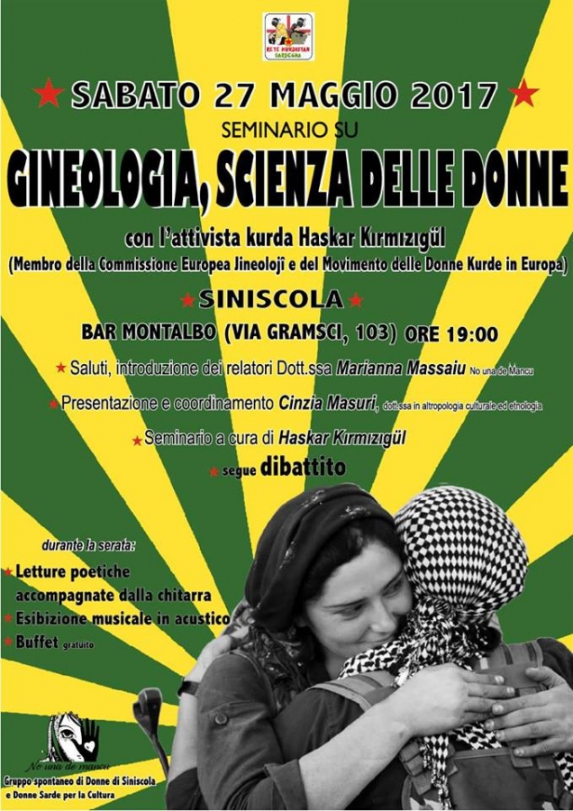 Il seminario (che nei giorni scorsi si è tenuto ad Alghero, Sassari e Cagliari) sarà curato dall’attivista curda Haskar Kırmızıgül, membro della Commissione Europea a Bruxelles sulla Jineolojî del TJK-E (Movimento delle donne curde in Europa).