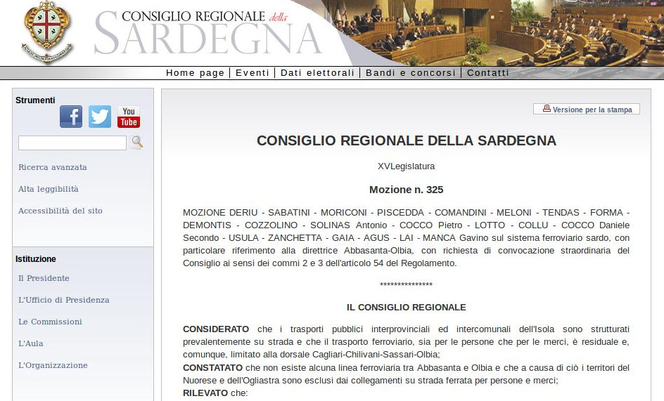 Il Consiglio regionale, riunitosi nella serata di ieri, ha approvato quattro di mozioni, due delle quali riguardanti il sistema ferroviario. Il documento presentato da Roberto Deriu (primo firmatario) e da altri 20 consiglieri ha per oggetto il completamento, ritenuto «strategico e prioritario», della rete ferroviaria sarda con la creazione della dorsale Abbasanta-Olbia.