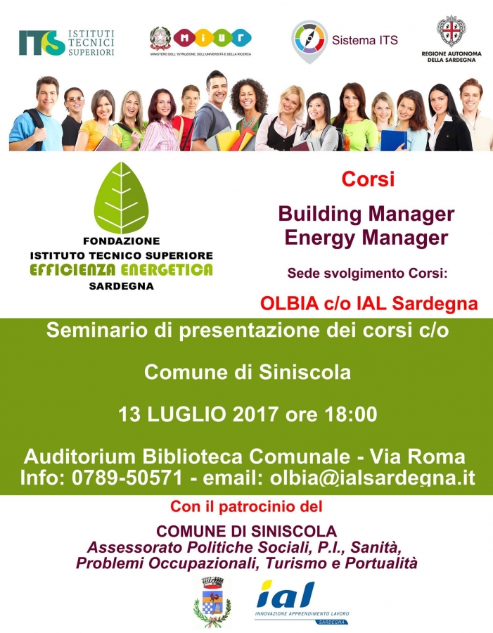 È previsto per domani, giovedì 13 luglio, un seminario di presentazione di corsi “Building manager” e “Energy manager” che si terranno a Olbia presso la sede Ial Sardegna. L’iniziativa di domani è patrocinata dall’assessorato comunale delle Politiche sociali e dallo Ial. Appuntamento alle 18.00 presso l’Auditorium della Biblioteca “Grazia Deledda”.