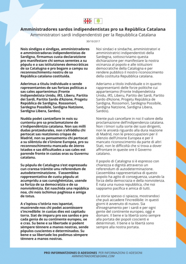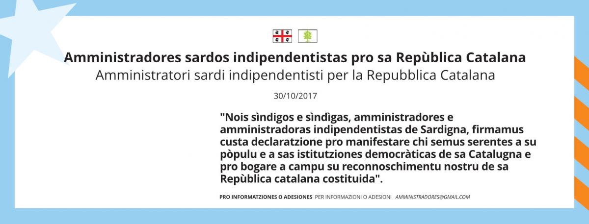 «Nois sìndigos e sìndigas, amministradores e amministradoras indipendentistas de Sardigna, firmamus custa declaratzione pro manifestare chi semus serentes a su pòpulu e a sas istitutziones democrà ticas de Catalugna». Inizia così il documento degli amministratori sardi indipendentisti in sostegno della neonata Repubblica. Tra i firmatari Graziano Spanu (sindaco di Lodè), Roberto Tola (sindaco di Posada) e Omar Cabras (sindaco di Torpè). Tra i consiglieri comunali troviamo Nino Fronteddu di Siniscola (gruppo Zente Nova - Ups). Sono più di 140 gli amministratori indipendentisti sardi che hanno sottoscritto un manifesto bilingue per il riconoscimento della Repubblica Catalana. Qui sotto il testo integrale.