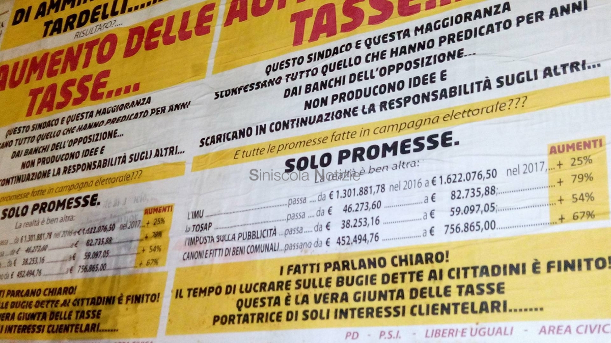 Attraverso un manifesto affisso nelle scorse ore, una parte delle opposizioni consiliari ed extraconsiliari riconducibili al centro sinistra (Pd, Psi, Liberi e Uguali, Area civica) ha contestato l’operato della Giunta Farris in merito alla sua politica fiscale. «In quasi due anni di amministrazione – si legge –, questo sindaco e questa maggioranza sconfessano tutto quello che hanno predicato per anni dai banchi dell’opposizione. Non producono idee e scaricano in continuazione la responsabilità sugli altri». Secondo le formazioni firmatarie del manifesto, «la realtà è ben altra rispetto alle promesse fatte in campagna elettorale». Citati i passaggi, «dal 2016 al 2017», dell’Imu («da 1.301.881,78 a 1.622.076,50 euro»), della Tosap («da 46.273,60 a 82.735,88»), dell’imposta sulla pubblicità («da 38.253,16 a 59.097,05») e dei canoni dei fitti di beni comunali («da 452.494,76 a 756.865»). Queste le percentuali rispettive citate nell’affissione: +25%, +79%, +54%, 67%.