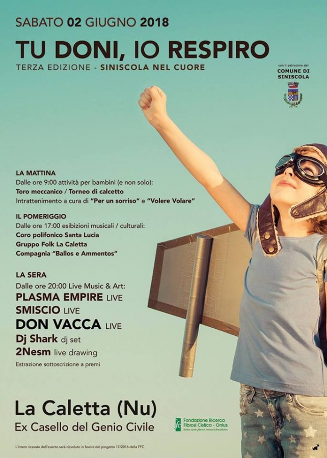 La Caletta. Si terrà per tutta la giornata di sabato 2 giugno la terza edizione di “Tu doni, io respiro”, evento benefit dedicato alla ricerca sulla Fibrosi cistica organizzato dal gruppo di sostegno spontaneo “Siniscola nel cuore” (riconosciuto ufficialmente dalla Fondazione Ffc onlus) con il patrocinio del Comune.