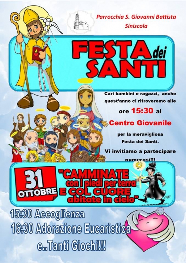È prevista per il 31 ottobre, presso il Centro giovanile parrocchiale, la "Festa dei santi". L'appuntamento, destinato ai bambini e ai ragazzi, è all'insegna dello slogan "camminate con i piedi per terra e col cuore abitate in cielo". Successivamente all'accoglienza, fissata per le 15.30, il programma prevede l'adorazione eucaristica, alle 16.30, e un pomeriggio all'insegna dei giochi e del divertimento.