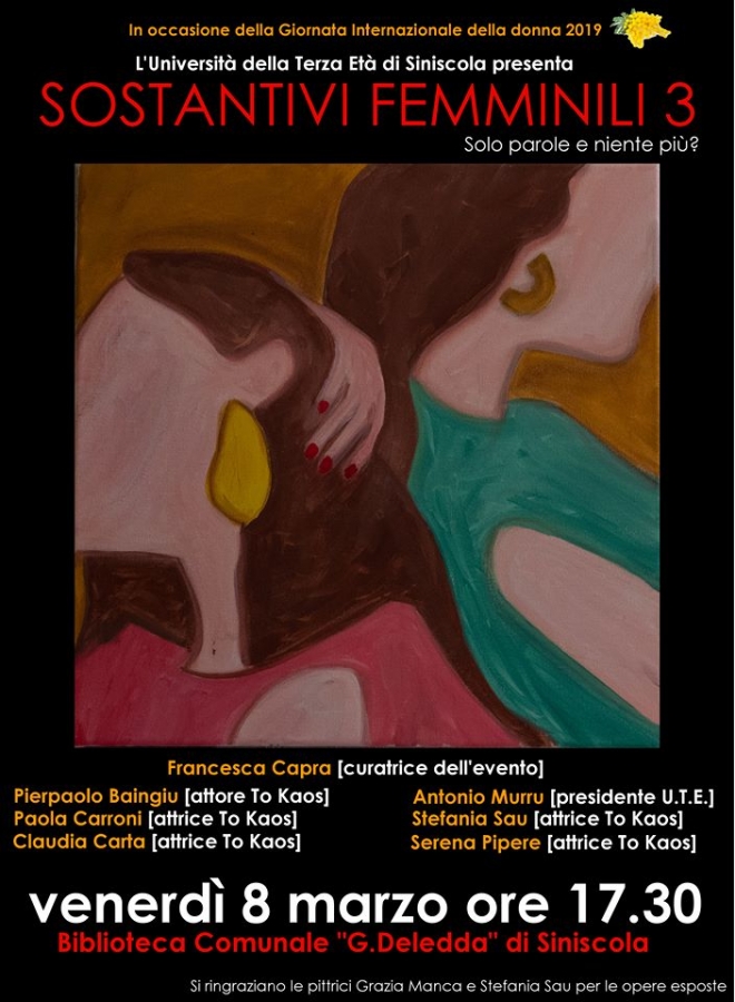 Questo pomeriggio, in occasione della giornata internazionale della donna, l'Università siniscolese della terza età ospita il reading "Sostantivi femminili 3" in collaborazione con gli attori della compagnia teatrale "To Kaos". «Francesca Capra ed alcuni amici del suo gruppo - spiega il presidente Ute Antonio Murru - hanno accolto con molta disponibilità l'invito che alcuni mesi fa avevamo loro rivolto per rendere speciale questa ricorrenza che quest'anno cadeva nella nostra programmazione del venerdì. Francesca ha proposto al gruppo una riedizione del reading "Sostantivi Femminili", che era stato già presentato al pubblico il 27 giugno presso Sa Corte Cumonale ed il 24 novembre presso l'Istituto Tecnico "Luigi Oggiano" in occasione della Giornata Internazionale contro la violenza sulle donne». Le letture, che appunto partiranno da alcuni sostantivi femminili, saranno affidate ad Antonio Murru e agli attori To Kaos Pierpaolo Baingiu, Paola Carroni, Claudia Carta, Stefania Sau e Serena Pipere. L'appuntamento è fissato alle 17.30 presso l'auditorium "Mirella Fenu" della Biblioteca comunale. «Ancora una volta - ha concluso Murru - ci schieriamo a favore dei diritti sostanziali delle donne, sempre più protagoniste della vita sociale e culturale delle nostre comunità (anche da noi all'UTE sono la maggioranza) e contro qualsiasi discriminazione derivante dal sesso, dal colore della pelle o da un diverso credo religioso. Sarà una bella serata da condividere con tutte le persone di buona volontà , ma esprimo a livello personale e a nome della nostra Associazione il rammarico per la mancata coordinazione e possibile collaborazione su eventi che avevano lo stesso tema e che hanno portato invece ad un possibile antagonismo, che non fa bene alla nostra comunità ».