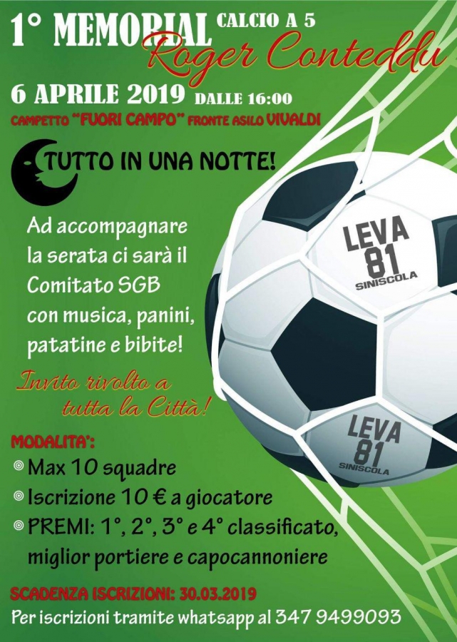 È previsto per domani, dal pomeriggio fino alla notte, il torneo di calcio a 5 “Primo memorial Roger Conteddu”. L’evento, che si svolgerà dalle 16.00 presso il campetto posto a fronte dell’asilo “Vivaldi”, è organizzato dalla Leva ‘81. «Insieme al nostro fedale Giancarlo Conteddu - hanno affermato i ragazzi del comitato - siamo orgogliosi ed onorati di aver avuto la possibilità di intitolare questo torneo all’indimenticato Roger». Il comitato San Giovanni sarà presente sul posto con un punto ristoro (panini, patatine e bibite) e tanta musica. Per maggiori info è possibile contattare il numero (anche WhatsApp) 3479499093.