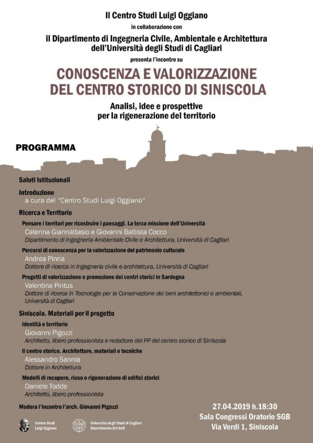 Questo pomeriggio, in collaborazione con il dipartimento di Ingegneria civile, ambientale e Architettura dell’Università di Cagliari, si terrà il convegno “Conoscenza e valorizzazione del centro storico di Siniscola”.