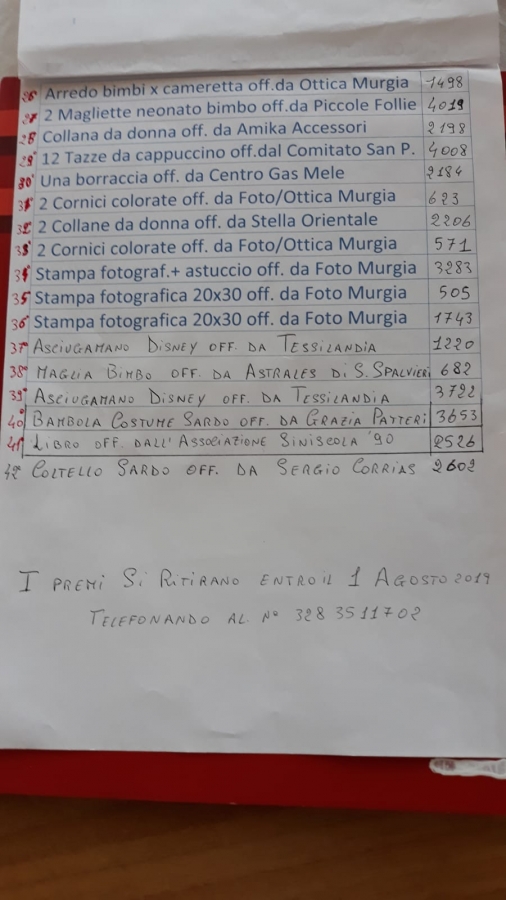 Come da tradizione, anche quest’anno i siniscolesi hanno festeggiato Santu Petru presso l’omonima località . L’appuntamento è stato curato dal priorato guidato da Gianni Poddie (presidente Gino Goddi). Per l’anno venturo il priore sarà Giovanni Goddi affiancato dal presidente Antonello Pau e dal vicepresidente Pietro Patteri. In riferimento alla lotteria, il primo premio del valore di 300 euro (offerto dal comitato) va al possessore del biglietto 2806.