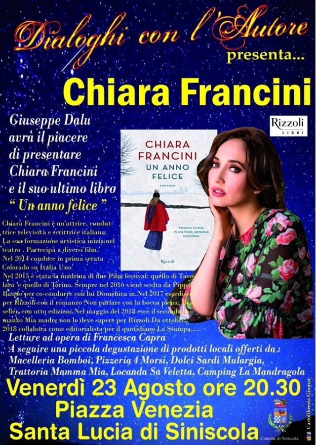 Nuovo appuntamento con i “Dialoghi con l'Autore” promossi dall’omonima associazione culturale. Venerdì 23 agosto, alle 20.30 presso Piazza Venezia di Santa Lucia, la scrittrice ed attrice Chiara Francini presenterà il suo nuovo libro "Un anno felice", edito da Rizzoli. Francini racconterà la genesi e gli sviluppi della sua ultima fatica interloquendo con Giuseppe Dalu e tra le diverse letture curate da Francesca Capra. «Le ragazze – si legge nella sinossi - attendono l’Amore. Quando arriva, il fulgore le abbaglia. Tanto che a volte non ne distinguono bene il volto.Melania, lunghi capelli mossi color castagna e due sopracciglia pennellate alla Rossella O’Hara, abita in centro a Firenze con la sua amica Franca. Potrebbero sembrare due studentesse fuori sede. In realtà sono solo due ragazze fuori corso a cui finora il tanto studio ha portato arguzia e cultura, ma non un principe azzurro». A seguire una piccola degustazione di prodotti locali offerti dalla macelleria Bomboi, dalla Pizzeria 4 Morsi, da Dolci Sardi Mulargia, dalla trattoria Mamma Mia, dalla locanda Sa Veletta e dal camping La Mandragola. L'inizativa è patrocinata dal Comune di Siniscola nell'ambito dell'Estate siniscolese.
