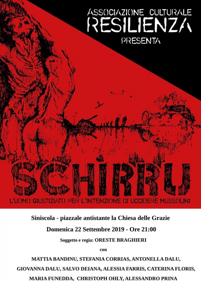 Andrà in scena domani, alle 21.00 presso il piazzale antistante alla chiesa delle Grazie, la rappresentazione teatrale dal titolo “Schirru, l’uomo giustiziato per l’intenzione di uccidere Mussolini”. «È la storia – spiegano i promotori, l’associazione Resilienza - di un giovane sardo, nato a Padria (SS) nel 1899. Nel 1917 parte con entusiasmo per la “grande guerra”. Al ritorno in Sardegna non c'è lavoro. A 21 anni segue il padre, da tempo emigrato a New York, che lo avvia al commercio delle banane. Partecipa alle lotte a sostegno di Sacco e Vanzetti. Aderisce all'anarchismo. Inizia a coltivare un'idea fissa, che diverrà ferma convinzione: uccidere Mussolini come unica soluzione per liberare l'Italia dal fascismo». Allo spettacolo (soggetto e regia di Oreste Braghieri) parteciperanno Mattia Bandinu, Stefania Corrias, Antonella Dalu, Giovanna Dalu, Salvo Deiana, Alessia Farris, Caterina Floris, Maria Funedda. Christoph Ohly e Alessandro Prina.
