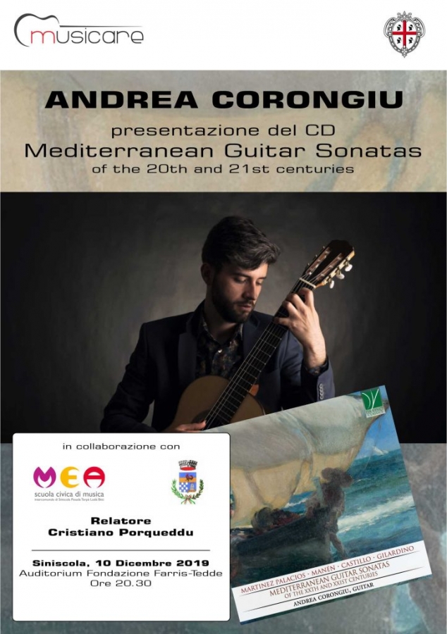 È prevista per questa sera, alle 20.30 presso l’auditorium della fondazione Farris È prevista per questa sera, alle 20.30 presso l’auditorium della fondazione Farris-Tedde, la presentazione del cd “Mediterranean Guitar Sonatas” del chitarrista Andrea Corongiu. All’appuntamento sarà presente il musicista nuorese Cristiano Porqueddu che descriverà le peculiarità del prodotto edito da Da Vinci Classics. L’evento (ingresso gratuito) si inserisce nella stagione concertistica dell’associazione Musicare ed è stato organizzato con la collaborazione della Scuola civica Mea (patrocinio comunale) e del Forum italiano di chitarra classica.