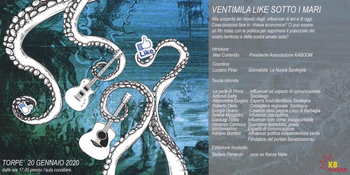 L’associazione Kaboom mette in calendario una nuova iniziativa per il 20 di gennaio. Alle 17.00, presso l’Aula consiliare del Comune di Torpè, si terrà “20mila Like Sotto I Mari”, convegno incentrato sul mondo degli influencer nel corso degli anni e su come questi potrebbero contribuire alla politica e all’economia dell’isola. La manifestazione sarà introdotta da Max Conteddu (presidente dell’associazione) con la partecipazione, nelle vesti di coordinatore, del giornalista de La Nuova Luciano Piras. In scaletta, come da nota stampa, gli interventi di «Le Perle di Pinna (influencer ed esperto di comunicazione), Antonio Satta (sociologo), Alessandra Guigoni (esperta food identitaria Sardegna), Roberto Deriu (consigliere regionale Sardegna), Giorgio Onano (creatore della pagina L’Eco di Barbagia), Selene Maggistro (influencer nota come Fidanzata Psicopatica), Gianluigi Tiddia (influencer noto come Insopportabile), Vincenzo Cannova (launeddista e poeta), Istintomaximo (esperto di comunicazione) e Adriano Bomboi (influencer di politica indipendentista sarda e fondatore del portale senatzione.eu)». Prevista anche l’esibizione di Stefano Ferrando, una delle voci dei Kenze Neke.