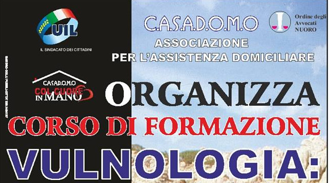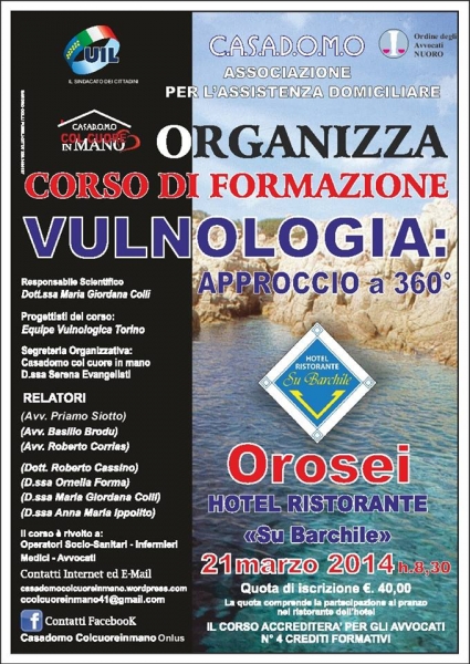L'associazione CasaDomo ColCuoreInMano Onlus, con sede a La Caletta e attiva da anni nel territorio baroniese, organizza – con il patrocinio dell'ordine degli avvocati di Nuoro e della Uil – il corso di alta formazione in vulnologia, branca della medicina che studia lesioni cutanee e contromisure. Saranno trattati temi quali cura e prevenzione di lesioni difficili, piaghe da decubito, ulcere. Il corso è rivolto a medici, OSS, infermieri, avvocati (ai quali saranno accreditati 4 crediti formativi), assistenti domiciliari e si terrà domani a Orosei (inizio ore 8.30) presso l'hotel-ristorante “Su Barchile”. La partecipazione è gratuita per medici, infermieri e OSS iscritti alla Uil (fino ad esaurimento posti). Interverranno gli avvocati Priamo Siotto, Basilio Brodu e Roberto Corrias, l'equipe di Torino (progettista del corso) composta dai medici Roberto Cassino, Ornella Forma, Anna Maria Ippolito, e la presidente dell'associazione Dott.ssa Maria Giordana Colli (responsabile scientifica del corso).