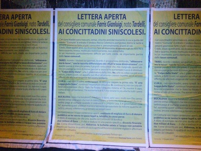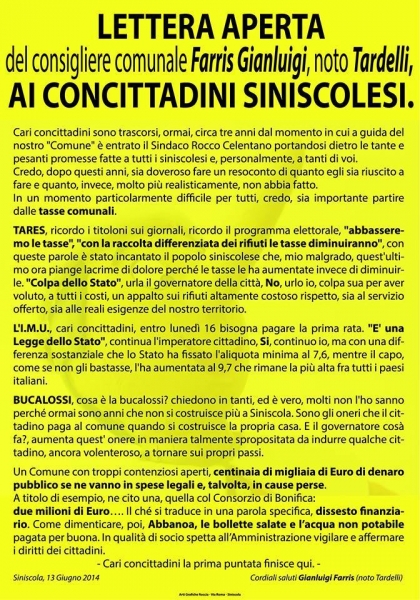 Al consigliere Tardelli, all'anagrafe Gianluigi Farris, non basta l'Aula Consiliare per manifestare la propria opposizione alla giunta Celentano. Una lettera aperta formato manifesto e su sfondo giallo campeggia sui muri siniscolesi. Un invito a riflettere sulle promesse della maggioranza a tre anni dal suo insediamento. Nel mirino di Tardelli le tasse sul servizio di raccolta dei rifiuti che, lungi dall'essere ridotte, crescono «per colpa sua (in riferimento alla maggioranza, ndr), per aver voluto a tutti i costi un appalto altamente costoso rispetto ai servizi e alle esigenze del territorio». Ma anche l'Imu, con un' aliquota («la più alta fra tutti i paesi italiani») aumentata al 9,7 rispetto alla soglia minima di 7,6, e la Bucalossi, i cui oneri sono « aumentati in maniera spropositata». In rassegna anche i «diversi contenziosi aperti», le «cause perse» come quella «con il Consorzio di bonifica», le «bollette salate di Abbanoa e l'acqua non potabile». «Cari concittadini – così si legge a fine lettera - la prima puntata finisce qui».
